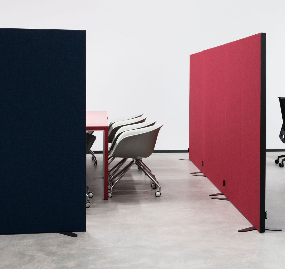 I en ejendom på Nordhavn, ejet af By og Havn, har vi leveret en række produkter til akustikregulerende kontorindretning. Kunden har, til skærmvægge og bordskærme, valgt en lækker dyb rød tekstil samt en nistret mørkeblå tekstil - begge med god kraftig struktur. Størrelserne for akustik-produkterne er tilpasset de ønskede borde, og farverne fra tekstilerne går igen i farven fra mødebordene, så hele indretningen fremstår stilfuld og indbydende.