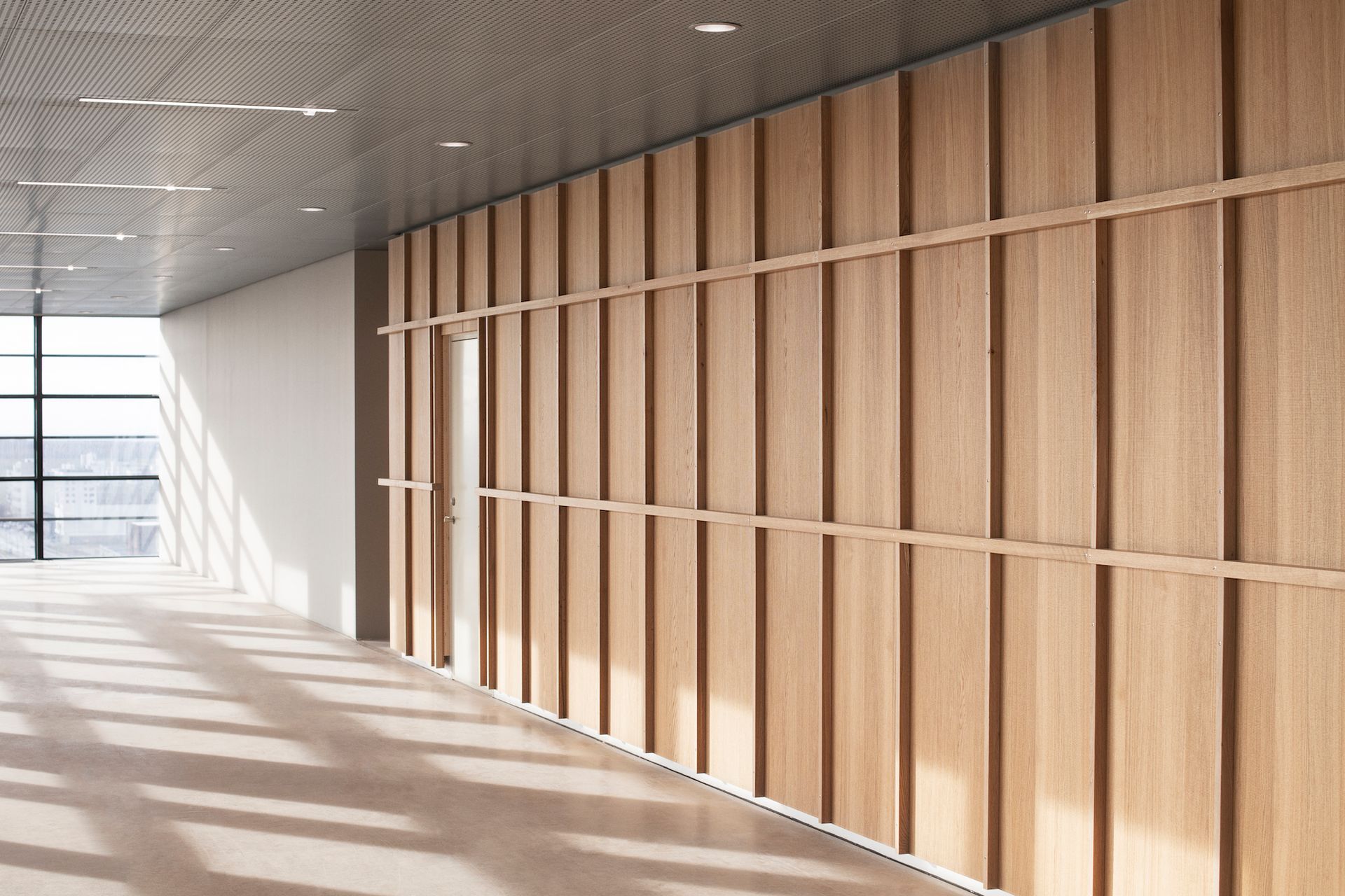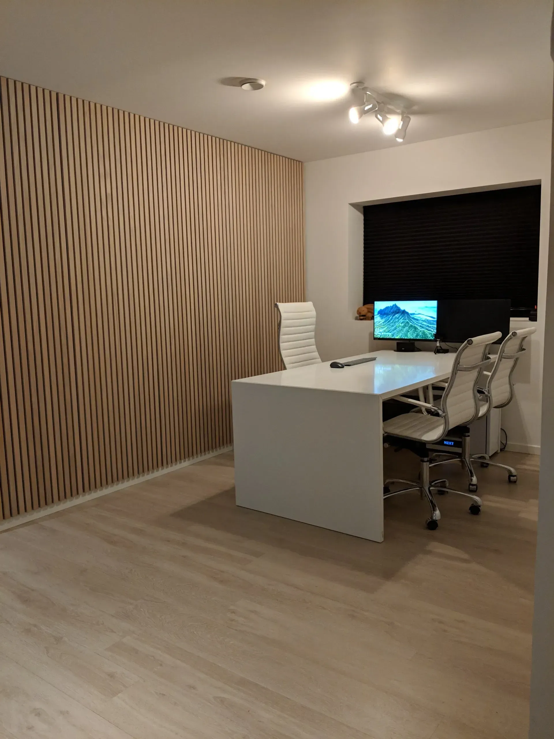 Til dette hjemmekontor har vi leveret otte akustikpaneler i 18 mm egetræslameller, som kunden selv har monteret med stor præcision.