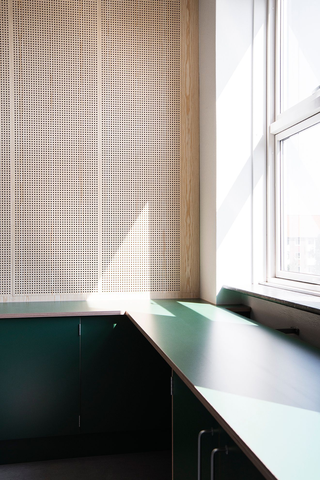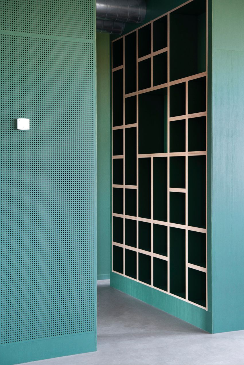 Farverne varierer fra etage til etage – rød, gul, blå og grøn – så panelerne indgår naturligt i skolens arkitektoniske farvetemaer.